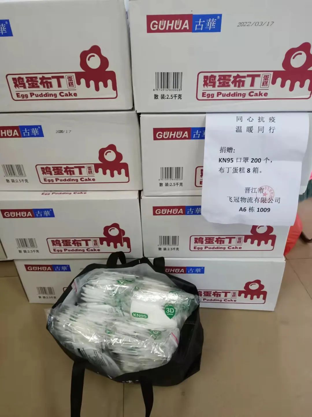 首先是捐赠,封控期间,主动向物流园防疫一线的保安室及正在封控管理的御龙府小区一线的医护人员和工作人员捐赠KN95防护口罩、面包、蛋糕等抗疫物资。